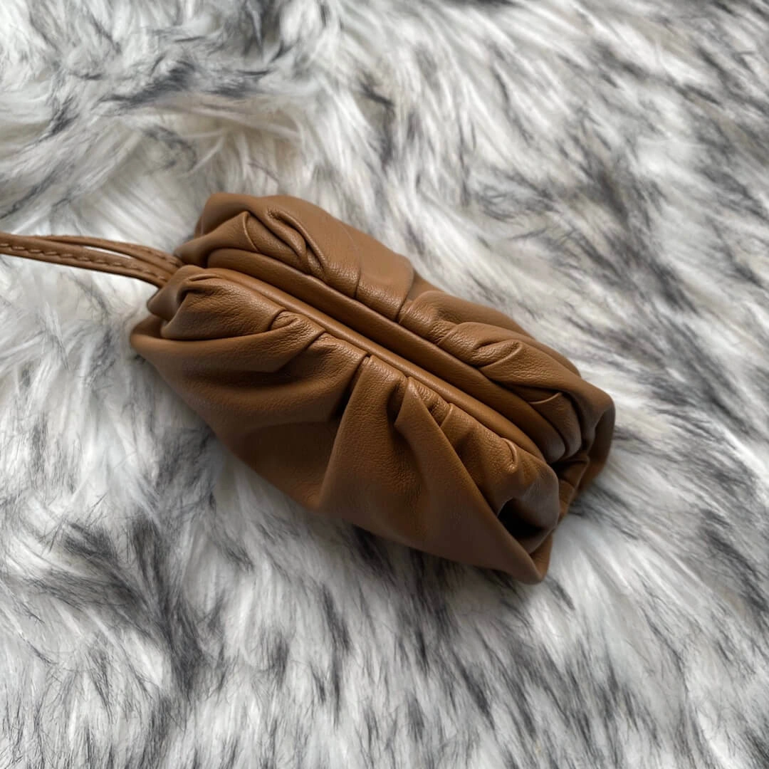 Discover a truly unique accessory with this beautifully designed mini pouch clutch. Its soft, gathered silhouette is crafted from supple calf leather, offering a luxurious feel and a modern, minimalist aesthetic. This compact bag is perfect for carrying your essentials with effortless style.
