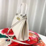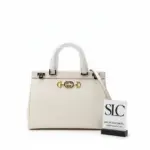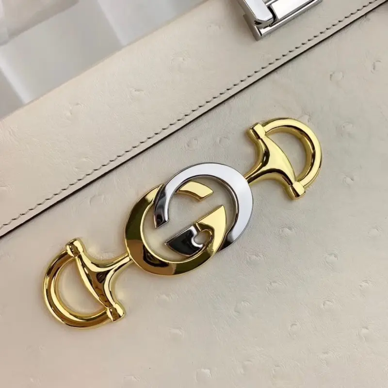 Experience timeless elegance with this impeccably crafted top handle bag, presented in luxurious white ostrich leather. Its structured silhouette and sophisticated design make it a versatile accessory for any occasion, seamlessly transitioning from a polished daytime carryall to an elegant evening companion. The bag is distinguished by a unique, two-tone hardware emblem on the front, combining polished gold and silver tones for a contemporary finish.
