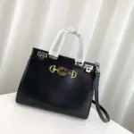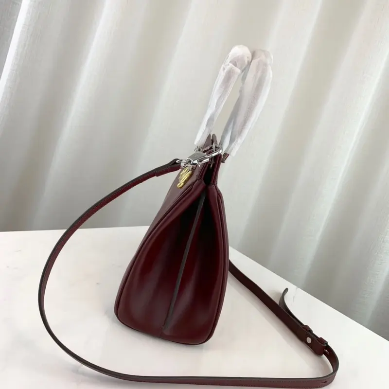Crafted from smooth, supple leather, this small top handle bag presents a structured silhouette that blends classic elegance with modern functionality. Its refined design is distinguished by a unique, decorative hardware element at the front, which elegantly combines two distinct motifs in a striking mix of gold and silver tones.